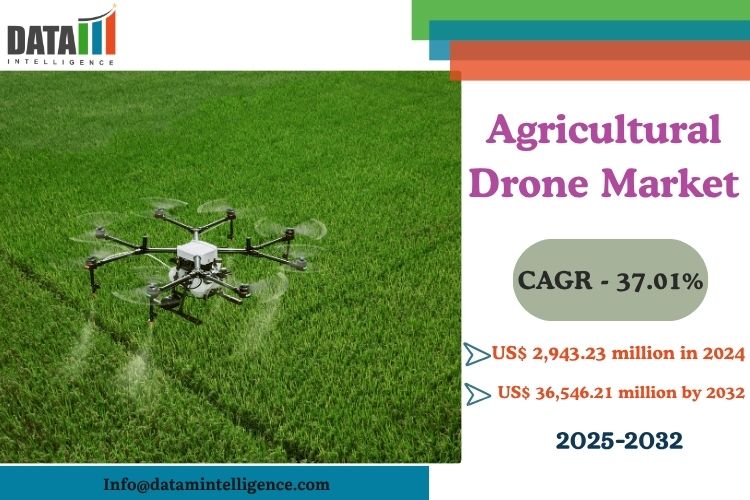AUSTIN, TX, UNITED STATES, October 10, 2025 /EINPresswire.com/ -- The agricultural drone market has emerged as a pivotal force in revolutionizing modern farming practices. In 2024, the global market was valued at USD 2,943.23 million and is projected to reach USD 36,546.21 million by 2032, exhibiting a robust compound annual growth rate (CAGR) of 37.01% during the forecast period (2025–2032). This significant growth is driven by the increasing adoption of precision agriculture techniques, advancements in drone technology, and the need for sustainable farming practices.